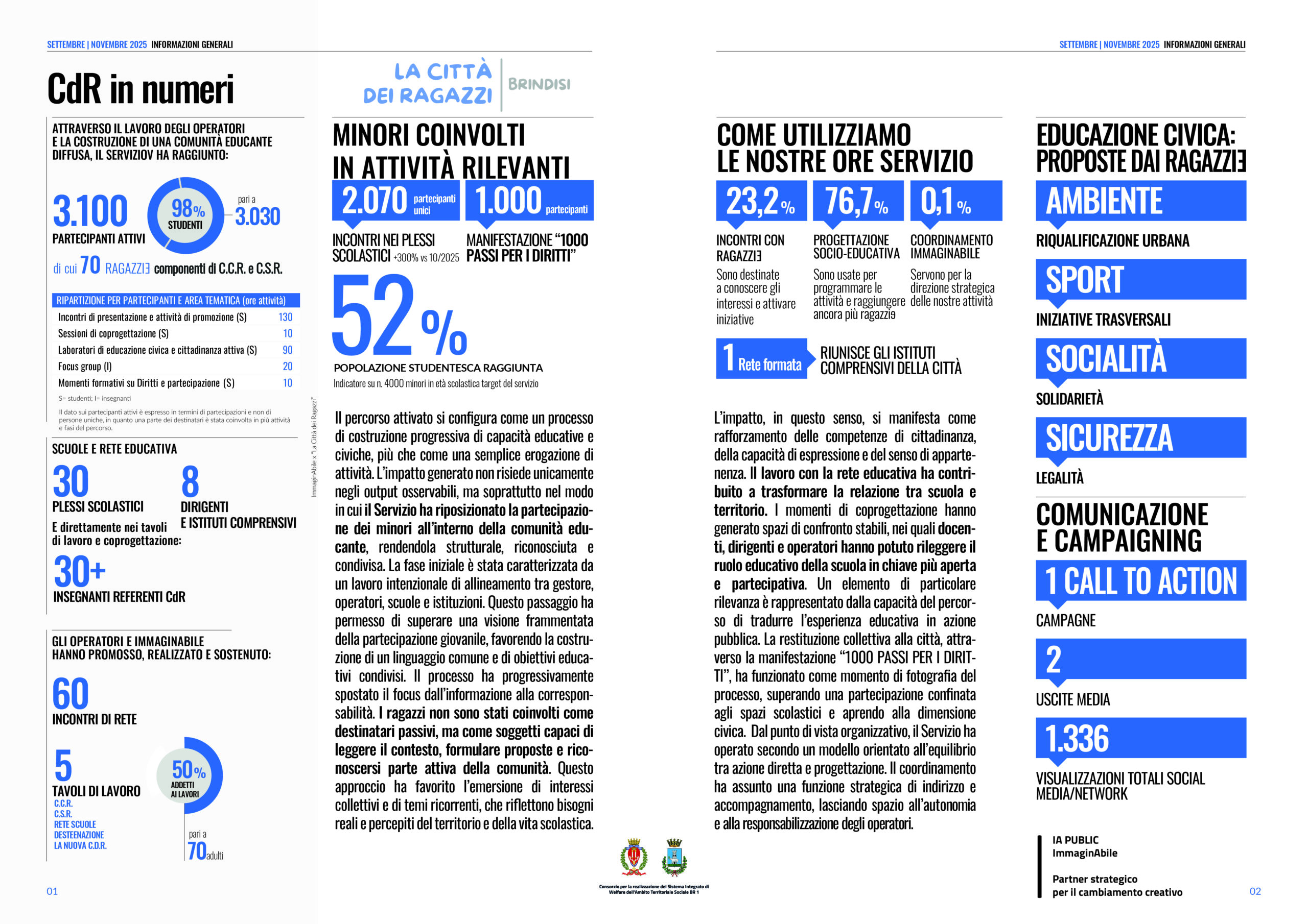 L’infografica sintetizza risultati e indicatori di valutazione che raccontano un processo educativo orientato alla corresponsabilità, al rafforzamento delle competenze di cittadinanza e alla stabilizzazione del lavoro di rete tra scuole, servizi e territorio. In questa prospettiva, l’impatto generato non si esaurisce negli output rilevati, ma si manifesta nella capacità del servizio di riposizionare la partecipazione dei minori come dimensione strutturale, riconosciuta e condivisa della comunità educante, ponendo le basi per una fase di sviluppo e consolidamento coerente con gli obiettivi di mandato.