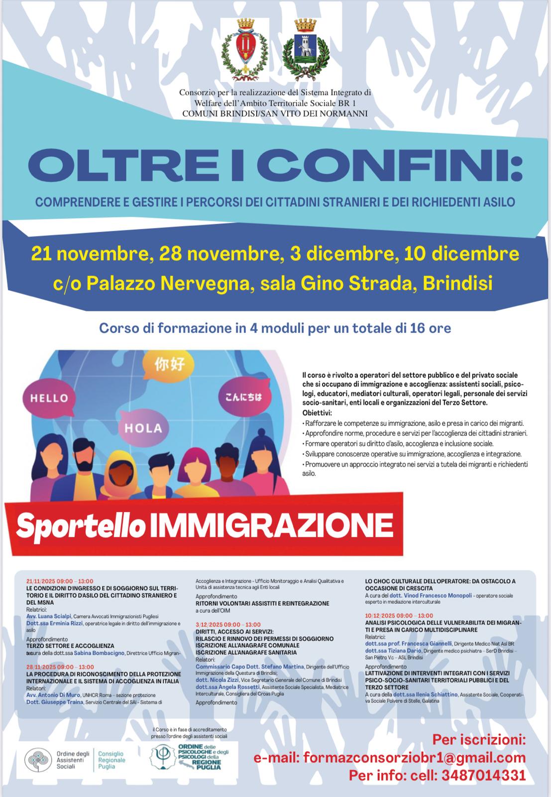 📢 Formazione gratuita per operatori del sociale! Il Consorzio ATS BR1 (Brindisi – San Vito dei Normanni) organizza il corso: 🌍 “OLTRE I CONFINI: comprendere e gestire i percorsi dei cittadini stranieri e dei richiedenti asilo” 📅 4 moduli – 16 ore totali 🗓️ 21 e 28 novembre, 3 e 10 dicembre 2025 📍 Palazzo Nervegna, sala Gino Strada – Brindisi (in fase di accreditamento presso l’Ordine degli Assistenti Sociali) Il percorso è rivolto a assistenti sociali, psicologi/psicologhe, educatori/educatrici, mediatori/mediatrici, operatori/operatrici legali sia del pubblico che del privato sociale 🎯 Obiettivo: rafforzare competenze su immigrazione, diritto d’asilo, accoglienza e inclusione.